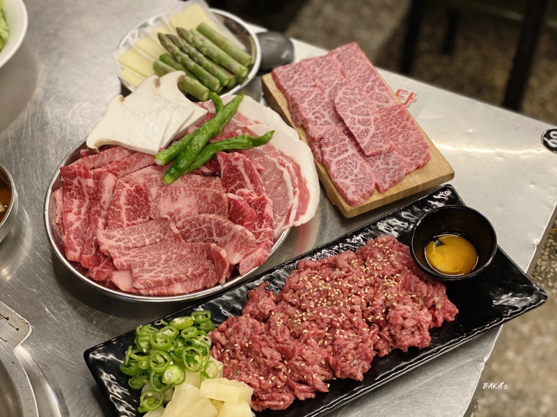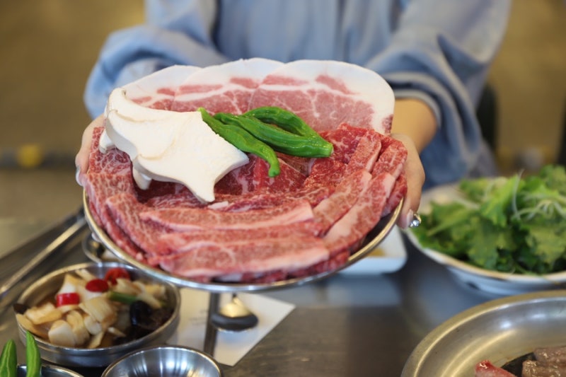 한우 안심 3인분은 117,000원이고 고기는 직접 구워야 한다.