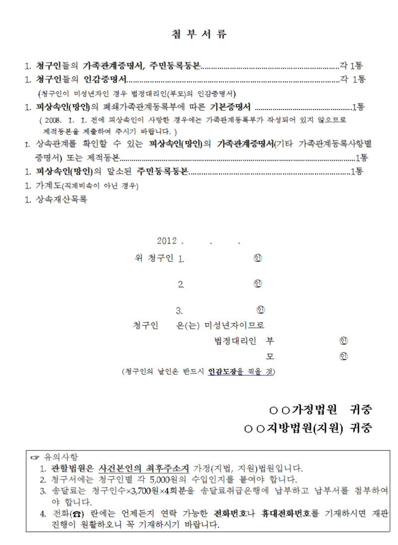그 다음에 신청을 하는 상속인의 신분 자료인데, 먼저 가족 관계 등록부를 제출함으로써 자신이 피상속인인 사실을 입증해야 합니다. 그리고 당사자의 표시 때문에 주민 등록 초본을 첨부할 인감 증명서를 첨부해야 합니다. 특히 인감 증명서는 다른 사람에게 부탁해서 발급되지 않고 반드시 본인이 직접 사무소나 구청 등을 방문하고 발급 받아야겠어요. 이는 일반 소송 절차와 달리 상속인이라는 포괄적 권리에 결정을 내린 절차이기 때문입니다.그리고 이런 각종 신상 자료가 갖추어지면 처음 신청인에 도장을 날인하고 인지대와 송달료를 납부한 뒤 숨진 피상속인의 재산 목록과 채무 목록을 첨부하고 법원에 제출하시면 됩니다. 다만 제출하는 재산 목록은 원칙적으로 안심 상속 원스톱 서비스를 신청한 뒤 그것부터 확인하는 재산 목록에 있는 잔고 증명, 부채 증명을 발급 받아 목록을 작성하는 증거 자료를 첨부하면 되지만 이런 자료를 수집하는데 많은 시간이 걸리는 일이 있습니다. 그러므로 이들 자료는 나중에 법원에 보정하는 방법으로 보완할 수 있습니다.